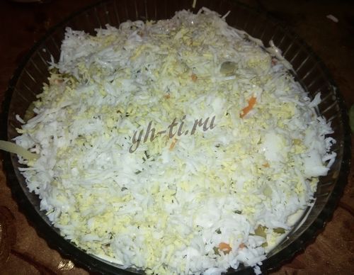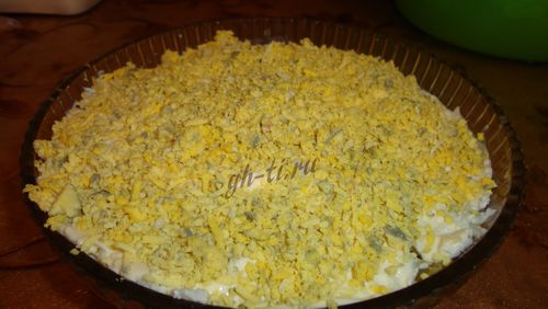Сразу же после огурчиков натираем белок от яиц. Сверху смазываем майонезом.