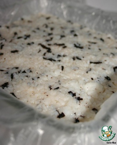 Выкладываем рис на наш салатик. Теперь наш суши-салат нужно поставить под гнет и дать настояться в течении нескольких часов.