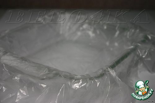 Приготовьте форму для салата и застелите ее пищевой пленкой.