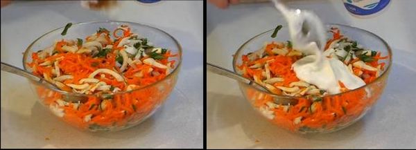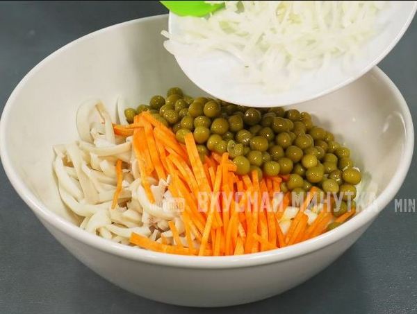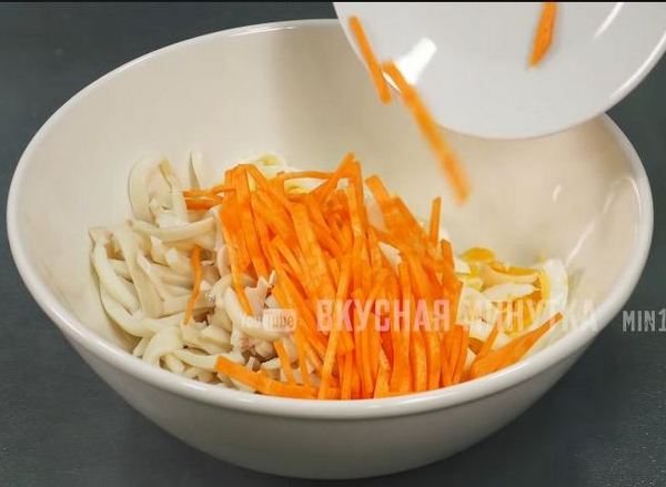 Думаю, понятно, что в таких салатах за основу берутся отварные кальмары и яйца, меняется лишь третий компонент. В данном случае используется морковь по-корейски.