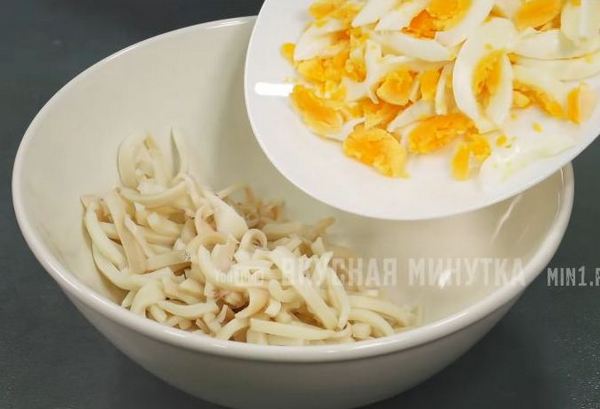 Как и прежде, кальмара чистим, моем, отвариваем и нарезаем. Также отвариваем и нарезаем яйца.