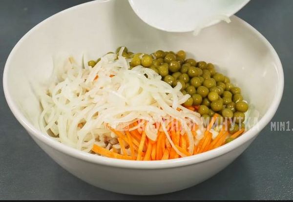 Свежую морковь натираем на терке. Из банки с горошком выливаем маринад, затем добавляем горошек в салат.