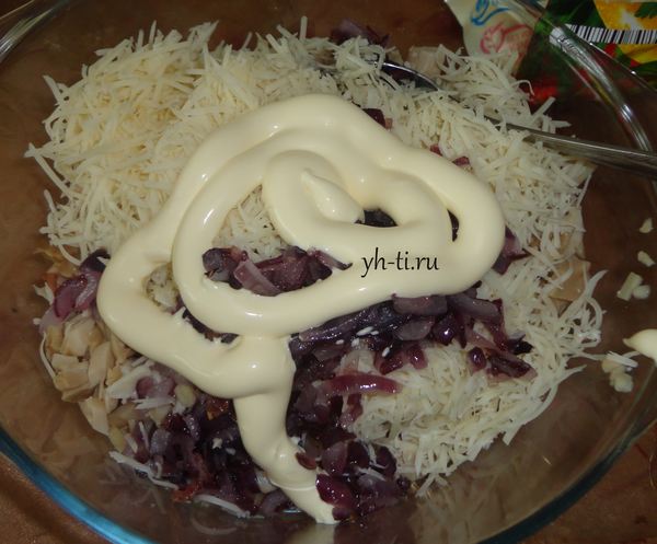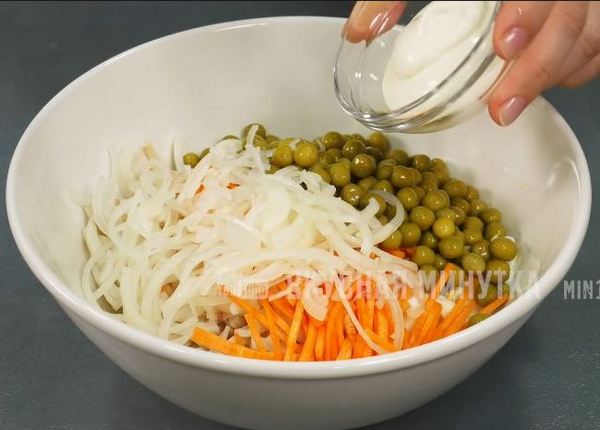 Смешиваем все ингредиенты. Солим по вкусу и заправляем майонезом.