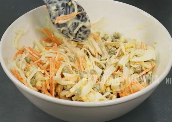 Смешиваем все ингредиенты. Солим по вкусу, добавляем майонез и перемешиваем. Наш нежнейший салат готов!