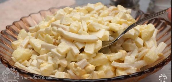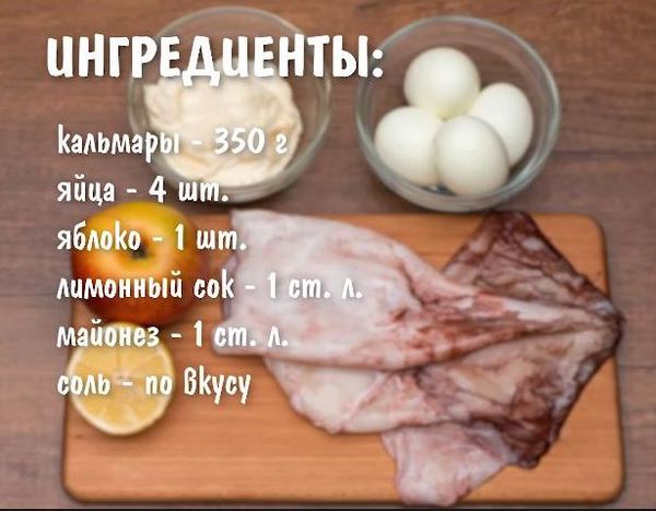 Яблоки тоже очень хорошо сочетаются с кальмарами. На вкус такой салат получается очень нежной и сочной.