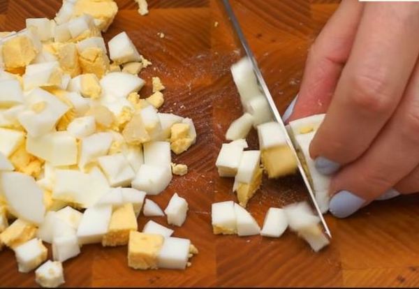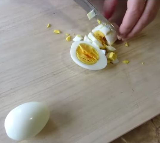 Яйца отвариваем вкрутую. Чтобы скорлупа лучше очищалась, после варки опускаем яйца в очень холодную воду. Чистим и режем.