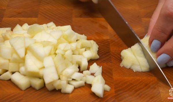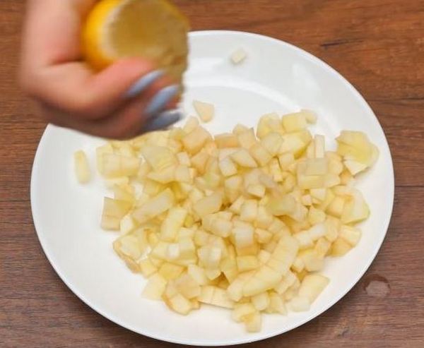С яблока снимаем шкурку, удаляем сердцевину и нарезаем кубиками. Чтобы яблоко не почернело, можно спрыснуть его небольшим количеством лимонного сока.