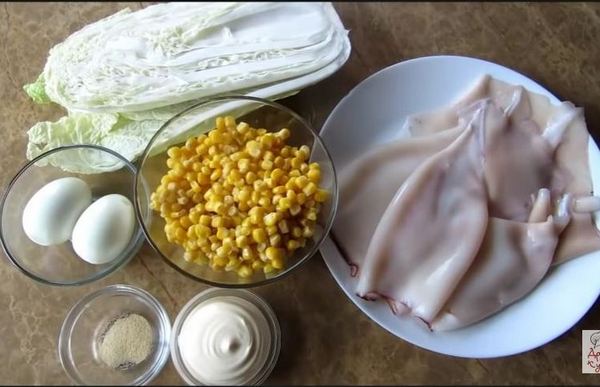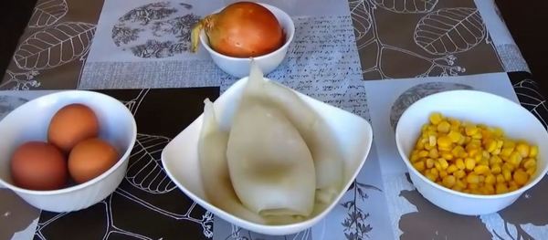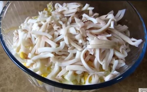 Всем хорошо знакомый салат с кукурузой и крабовыми палочками тоже можно разнообразить присутствием кальмаров.