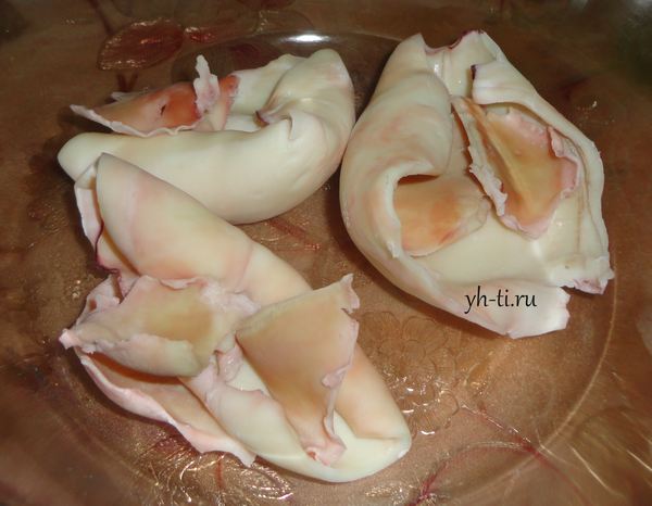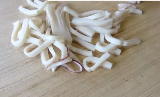 Кальмары очищаем описанным выше способом, а после отвариваем в кипятке пару минут.