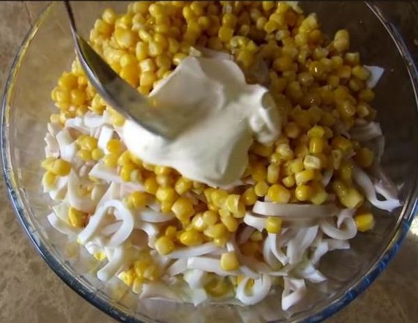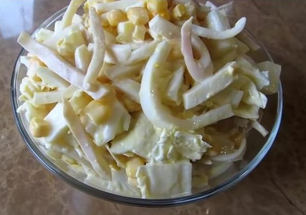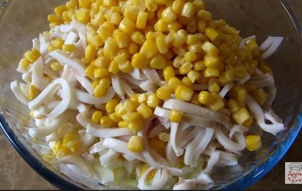 Салат с кальмарами, кукурузой и крабовыми палочками