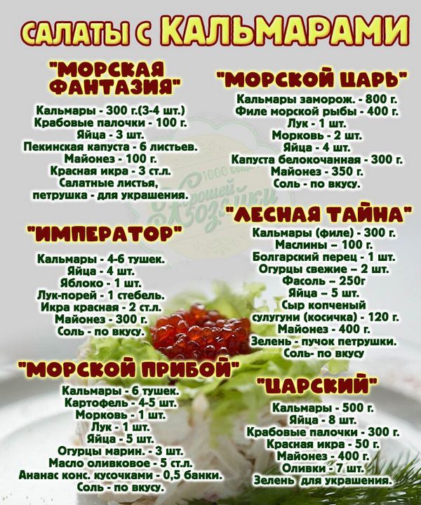 Салатики с кальмарами особенно вкусные , спасибо за рецептики.
