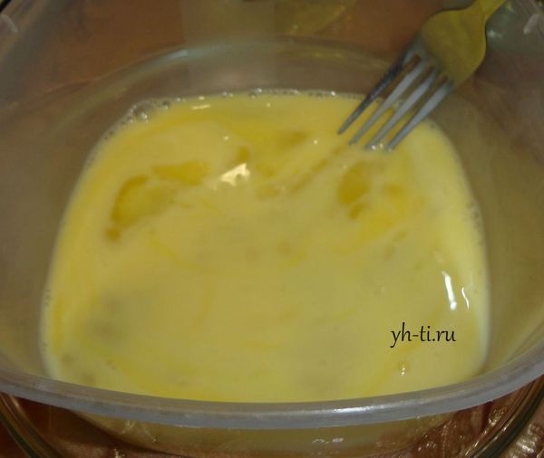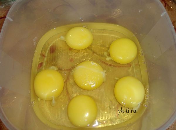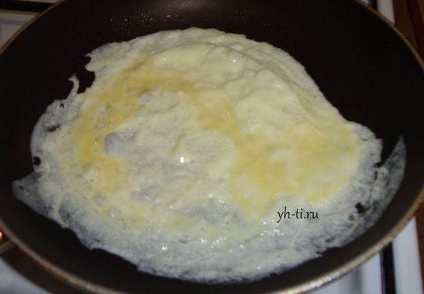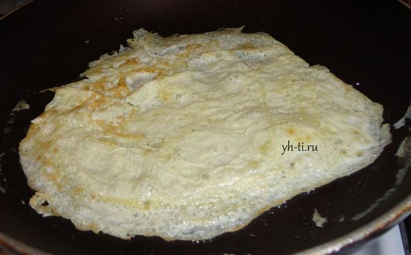 Пока главный ингредиент остывает после жарки, приступим к приготовлению блинчиков. Яйца разбиваем, разбалтываем и обжариваем на небольшом количестве растительного масла с одной и с другой стороны. Кстати, гораздо удобнее разбивать яйца поочерёдно в чашку и обжаривать так по одному, то есть разбиваем одно яйцо — жарим один блин. Затем — второе и т. д.