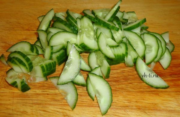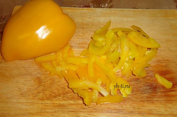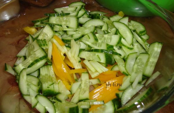 Огурец и перец режем соломкой. Также режем кальмары. Если тушки маленькие, можно нарезать кольцами.