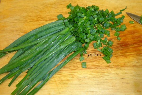 Лук тоже чистим и режем. Чтобы из него ушла горечь, можно предварительно замариновать его в воде с уксусом, или просто обдать кипятком.