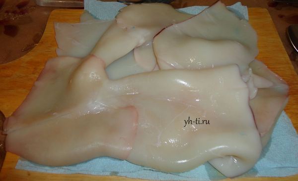Для начала почистим кальмары. Для этого нужно опустить их на несколько секунд в кипяток, а затем в очень холодную воду. После такой процедуры шкурка с них легко очищается. Кстати, если повторить «купание» кальмаров в горячей и студеной воде трижды, то их уже можно не варить, а сразу приступать к нарезке.