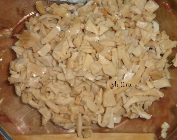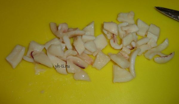 Шампиньоны нарезаем кусочками. Также поступаем и с кальмарами. Кстати, можно использовать и свежие грибы, но таком случае их нужно будет предварительно обжарить.