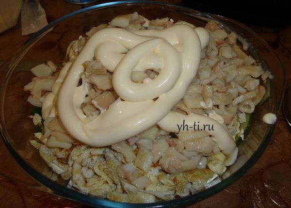 Салат с кальмарами, яичными блинами и болгарским перцем