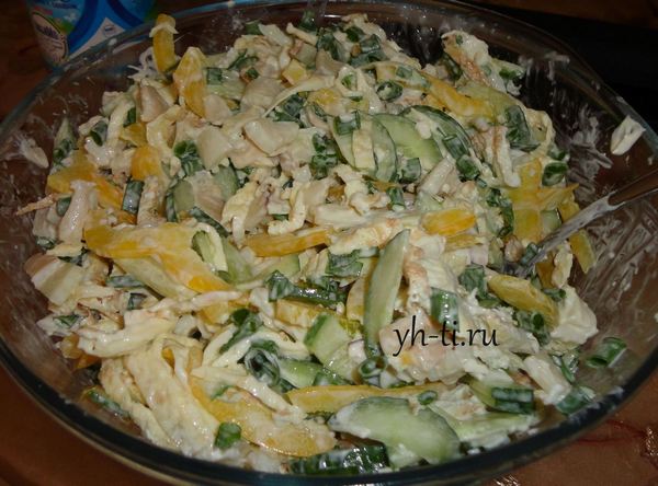 Блины скручиваем в трубочку и нарезаем. Смешиваем все ингредиенты. Солим по вкусу. Добавляем нарезанный зеленый лучок и заправляем майонезом. Вкуснейший салатик готов!