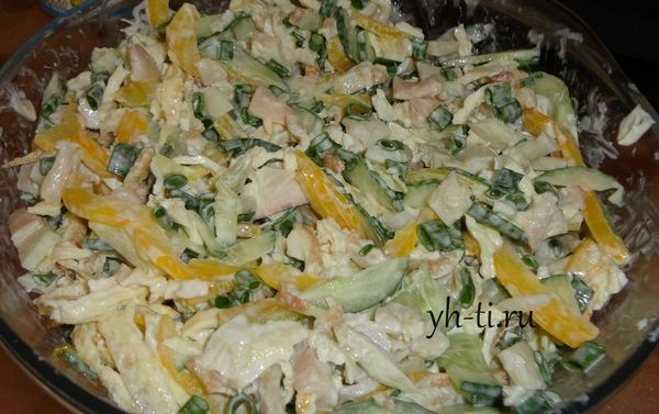 Если вы любите салаты со свежими и хрустящими овощами, к ингредиентам из предыдущего рецепта добавьте ещё пекинскую капусту. Получится очень полезный и вкусный салат.