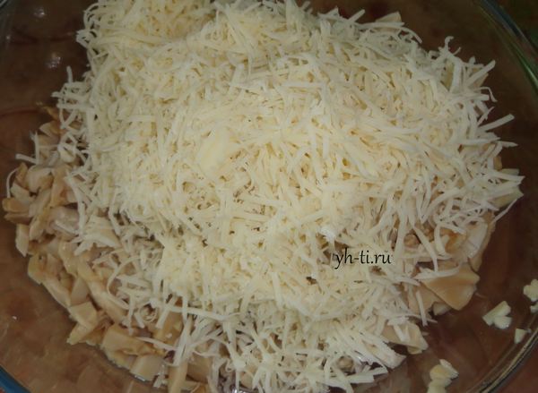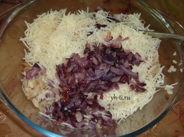 Также добавляем натертый сыр и измельченные грецкие орехи.