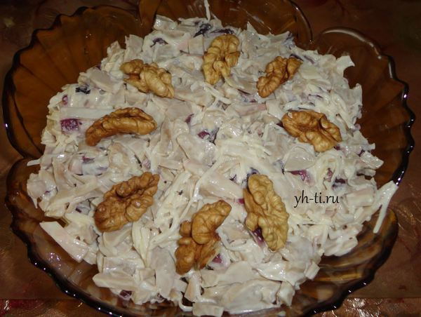 Заправляем салат майонезом или йогуртом. И сверху украшает четвертинками грецкого ореха.