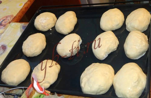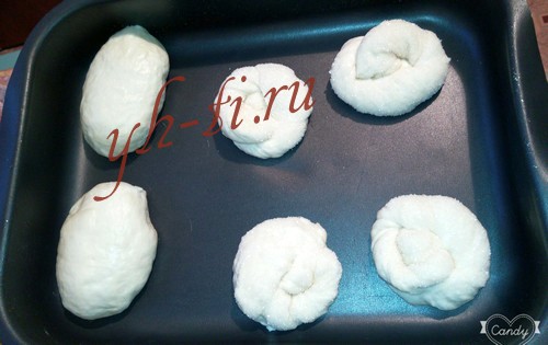 Также из этого теста я пеку рыбный пирог и стряпаю обычные булочки. В булочки ничего не добавляю, только макаю верхушку в сахар. Формирую булочки очень просто: делаю из теста колбаску и закручиваю в “узелочек”.