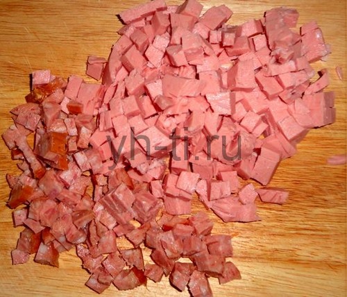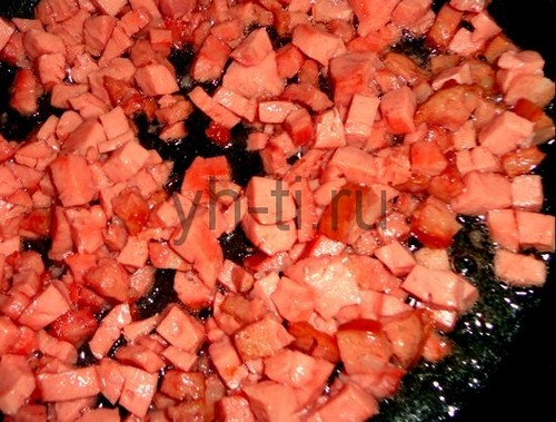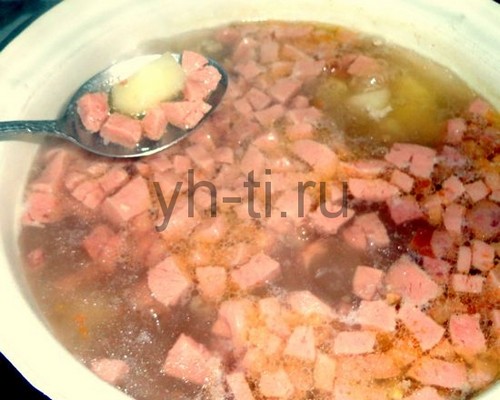 Шаг 2. Когда мясо будет готово, нарезанный кубиками картофель (2-3 штуки) отправьте в мясной бульон. Далее займитесь приготовлением заправки. На небольшом количестве любого растительного масла обжарьте мясные деликатесы, после чего также забросьте их в кастрюлю, продолжайте варить суп на медленном огне. Если в колбасах присутствует совсем незначительное количество жира, то можно обойтись и без обжаривания. Солянка с картошкой и мясными продуктами должна потомиться еще минут 20.