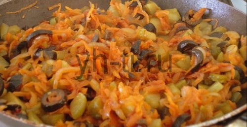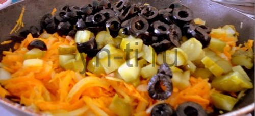 Спустя минут 5 добавьте порезанные огурцы и оливки (можно оливки не пассеровать, а сразу добавить в суп)