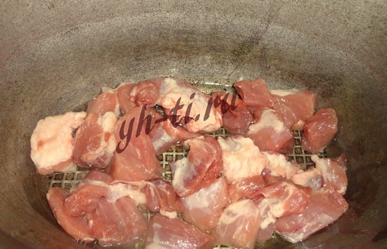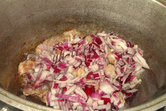 Мясо обжариваем до появления красивого румянца. Я обжаривала в казане, можно также использовать глубокую сковороду.