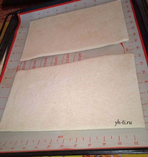 Слоёное тесто достаем из упаковки и сразу выпекаем. Чтобы тесто не прилипало к противню, используйте пергамент или коврик для выпечки. Если нет ни того, ни другого, просто немного смажьте противень маслом.