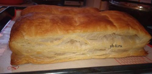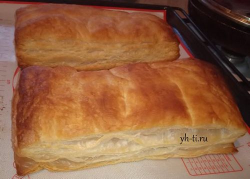 Ставим слоёное тесто в разогретую духовку и выпекаем при 180 градусах. Готовится оно быстро. Как только всё станет румяным, вынимаем. По времени ориентируйтесь по своей духовке. У меня ушло примерно 15 — 20 минут.