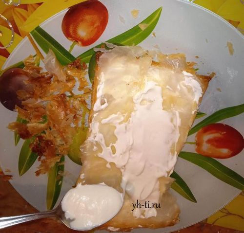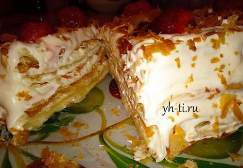 Все тонкие слои пропитываются кремом — заварным или масляным. Последний не рекомендую, так как получается очень жирно. Заварной крем лучше подходит для Наполеона, на мой вкус. А если ещё взбить сливки и добавить в заварной крем, то получится очень вкусный крем-пломбир. В следующей посте напишу его рецепт.