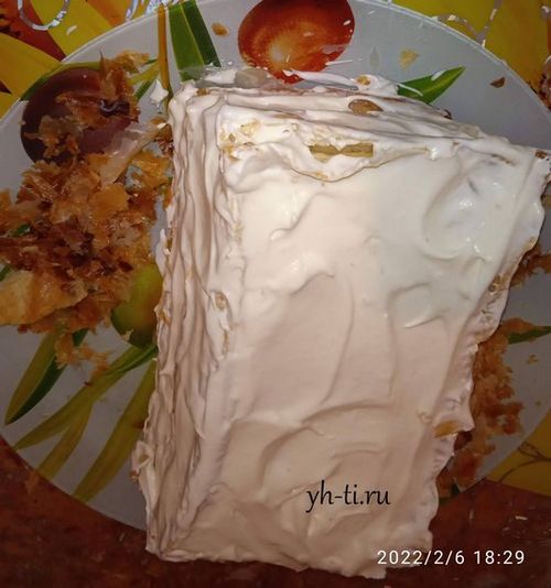 Даём тесту остыть минут пять. И приступаем к сборке торта. Для этого делим тесто на слои. Верхний румяный слой крошим, эти крошки понадобятся для украшения. Поочерёдно выкладываем слои на тарелку и промазываем каждый приготовленным заранее кремом. Собирается «Наполеон» очень быстро.