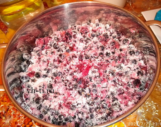 Итак, ягоду засыпаем сахаром, перемешиваем и оставляем на несколько часов. У меня она провела в таком виде ночь в холодильнике.