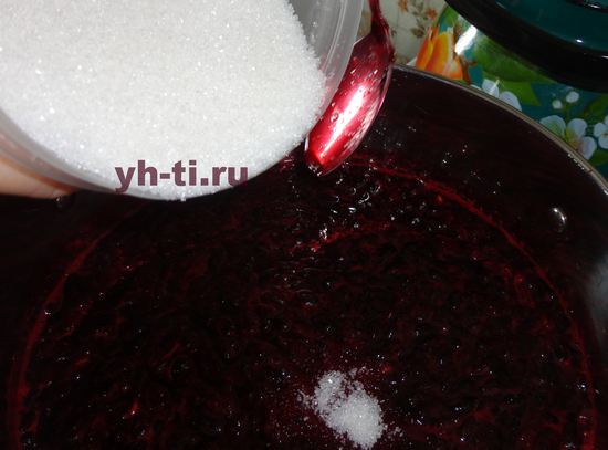 После этого высыпаем сахар. Его потребуется столько же, сколько и ягод, т.е. пропорция 1:1. Постепенно высыпаем сахар (у меня это 1,5 литра) и не перестаем перемешивать. Когда сахар растворится, не дожидаясь закипания, отключаем огонь.