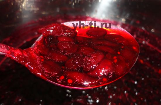 Даем нашему варенью остыть, вынимаем вишневые веточки и разливаем по банкам. Вкусное варенье из жимолости готово!
