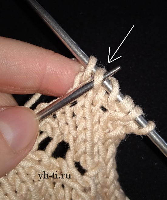 2 ряд. В изнаночными ряду отдыхаем и вяжем все петли, как они идут (те петли, что в первом ряду узора были лицевыми, сейчас, соответственно, вяжем изнаночными, и наоборот, изнаночные вяжутся здесь лицевыми, накиды вяжем изнаночными). Накиды вяжем НЕ скрещенными, чтобы формировались дырочки.