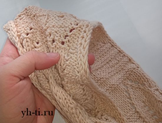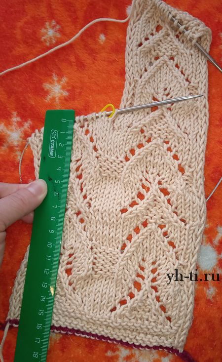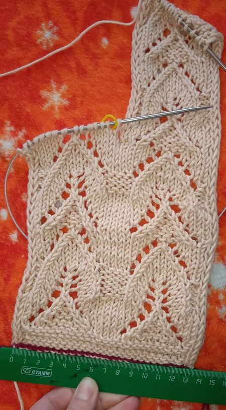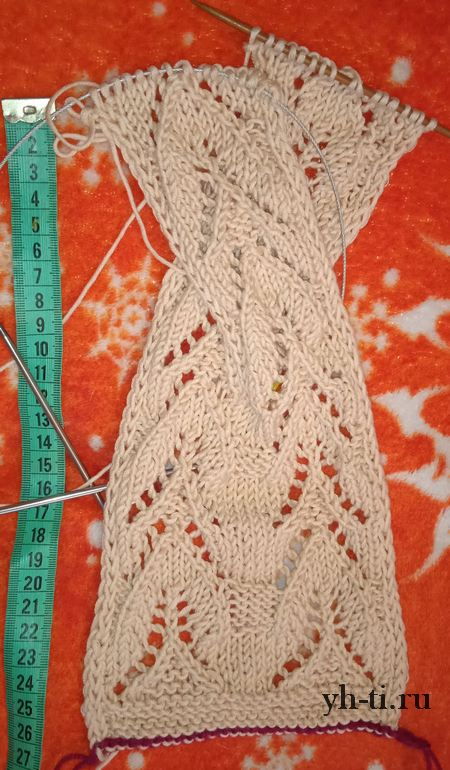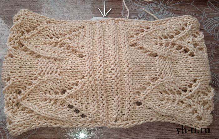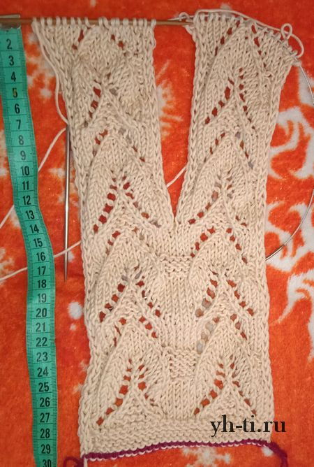 Когда будет привязано в высоту 2 раппорта узора, оставляем первую половинку и переходим ко второй. Также вяжем 2 раппорта узора вверх.