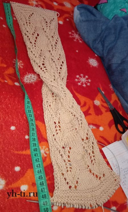 Я вяжу на обхват головы 57 см. Общая длина повязки должна быть не более 48-49 см.