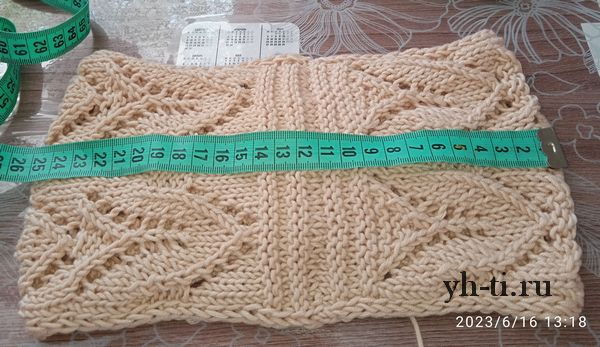 Как обычно, в начале нужно связать образец, измерить его, затем постирать и вновь сделать замеры. Стоит отметить, что хлопок после стирки растягивается. Если не вяжете образец, учитывайте этот момент.