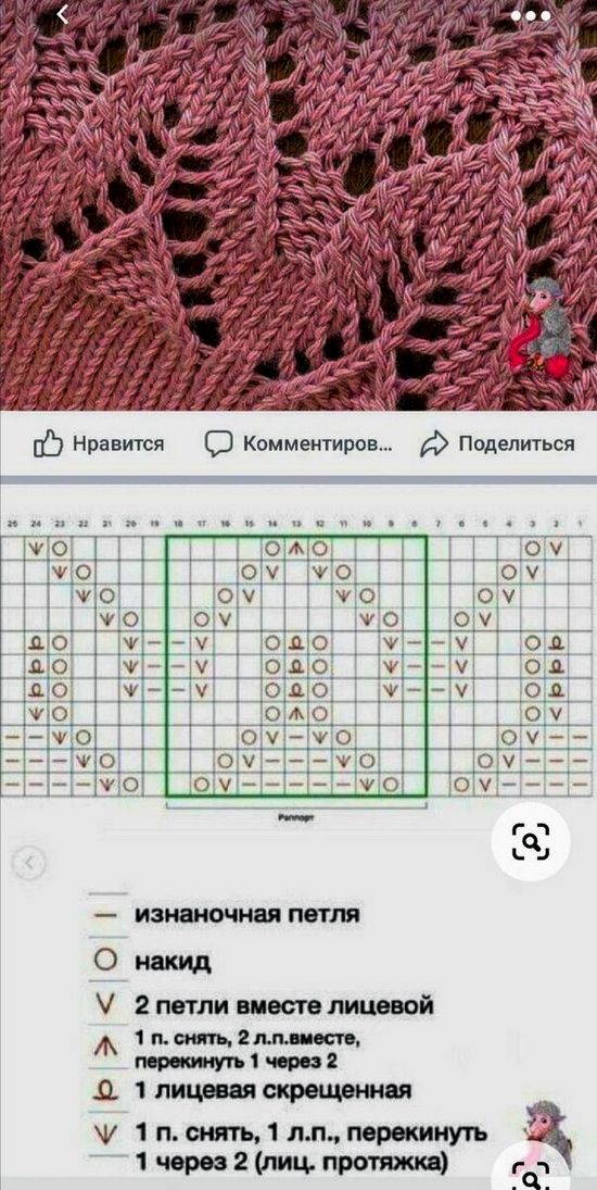 1 ряд узора. Первые 2 петли формируют красивую кромку, провязываем их, как описано выше. Затем вяжем по схеме: 1 лиц., накид, 1 петлю переснять не провязывая, 1 лиц., перекинуть непровязанную петлю через следующую за ней лицевую (см. фото ниже). 5 изнаночных. Две петли провязать вместе за передние стенки (левые стенки петли). Накид. Лицевая. Провязать 2 лицевые. И повторить раппорт.