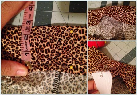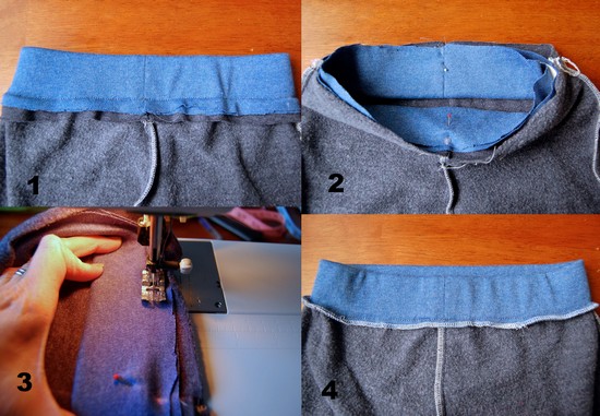 На брюках так же расставляем 4 булавки через равные промежутки и совмещаем с булавками на резинке и прошиваем