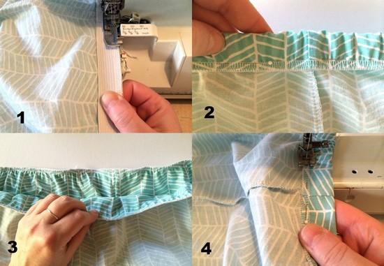 Подворачевыем верхний срез и прошиваем, оставив открытый участок для резинки