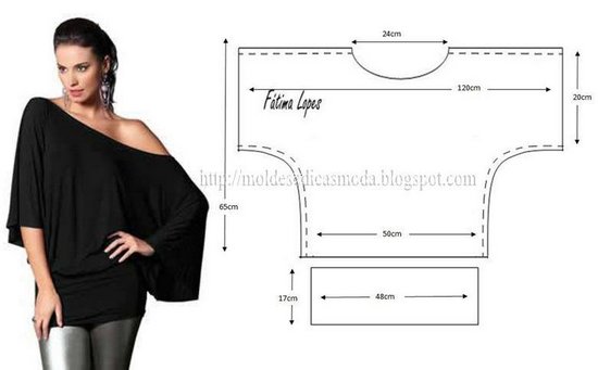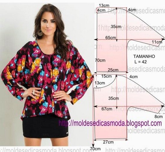 Из выше представленным материалов видно, что сшить одежду с широким рукавом вовсе не сложно. Вот еще некоторые идеи туник и блуз. Расчеты на выкройках даны для португальских размеров (tamanho — размер), таблицы размеров прилагается.