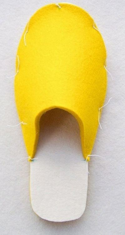 - Узелок спрячьте между слоями обуви. Хорошо закрепите нить и прошейте тапочки по краю, начиная от точки 3.