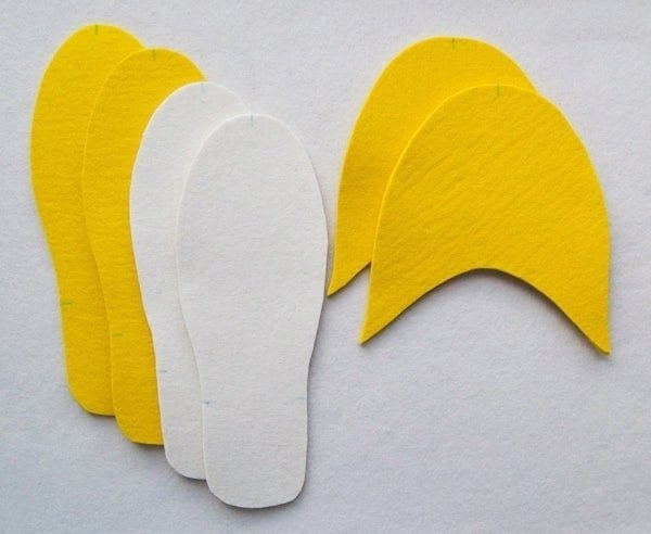 - Вырежьте 4 детали подошвы и 2 детали верха тапочек. Перенести все метки.