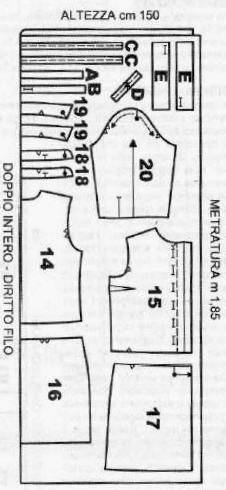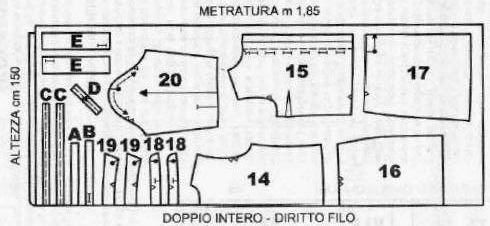 На сложенной в сгиб ткани, распределите детали выкройки (2 раза детали 18,19, С и Е), см. схему. То же самое сделайте на клеевом проклад. материале с деталями 18,19 и Е. Выкроите детали платья на кулиске с припусками 1 см, на подгиб низа — 4,5 см.