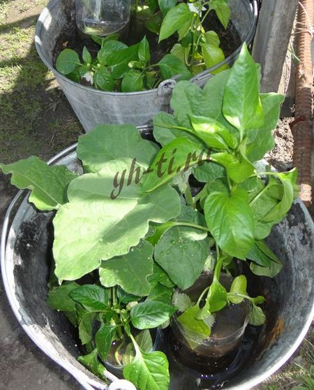 Перед пересадкой стаканчики с рассадой помещаем в ведра с водой, благодаря этому все содержимое стаканчика вынимается очень легко и корни не повреждаются.