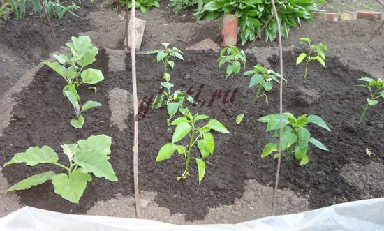 Баклажаны и перцы не переросли, поэтому высаживаем их, как обычно, стоя