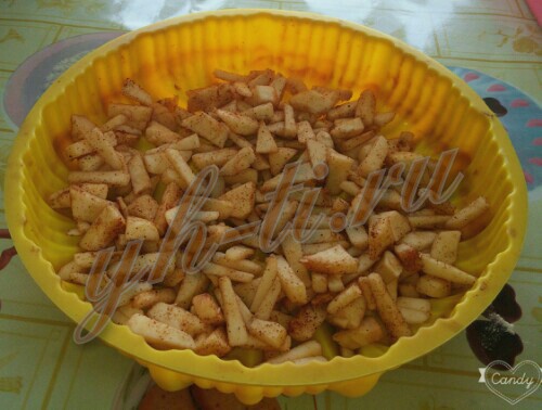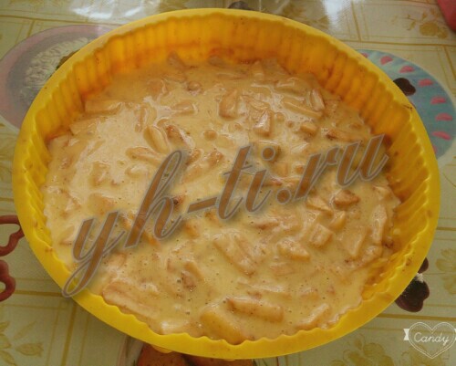 После выкладываем яблоки в форму для запекания и сверху заливаем тестом.